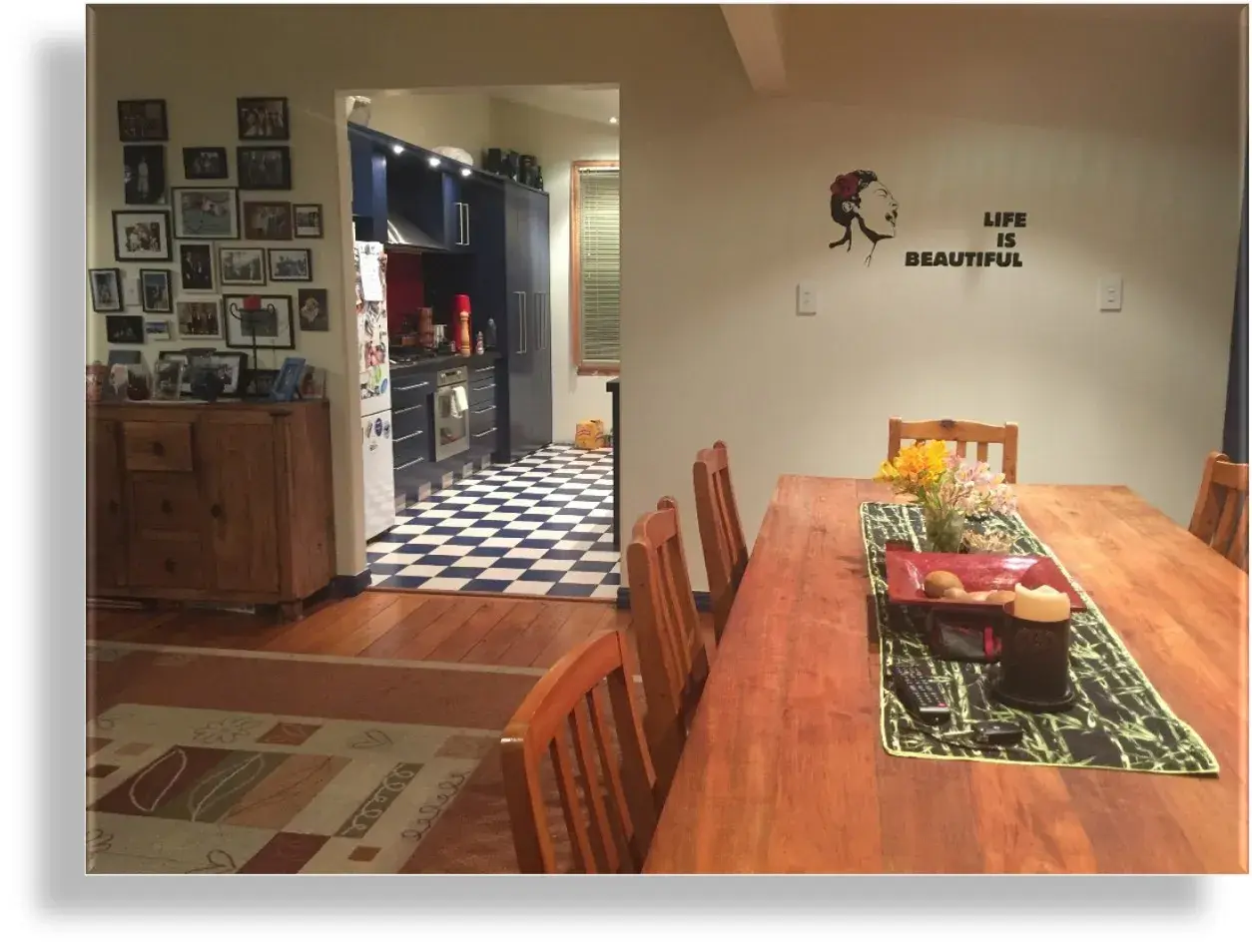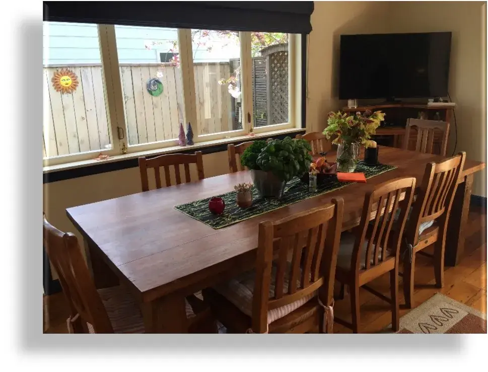 3 bed one bath, owners use 4th room as storage. Semi furnished with immovable furniture which includes dining suite, couch, fitted bookshelves with some books (can be removed), rugs to protect hardwood floors), 2 beds (a queen and a queen single), two sideboard/cabinets plus wall mirror in hallway, fridge, washing machine, and dishwasher and gas cooker. Off street parking 2 cars. outdoor shed.